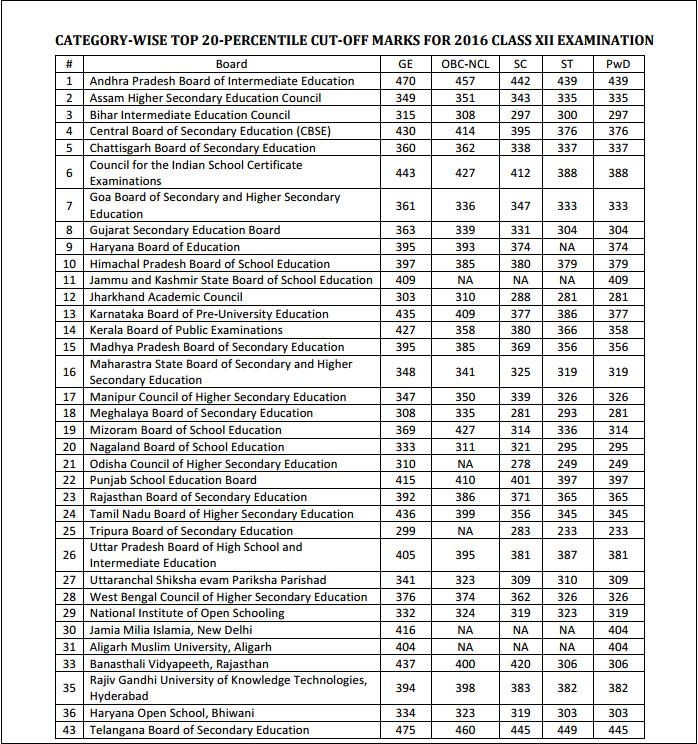 Top 20-Percentile Cut offs for 2016 - Class XII Boards: