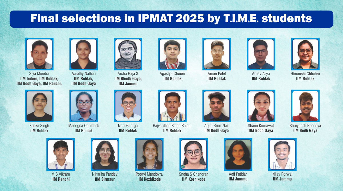 A distinguishing feature that exemplifies the quality of T.I.M.E.'s teaching are the results that our students secure. In the latest CAT 2022 exam, 2805 T.I.M.E. students made it to the prestigious IIMs.
