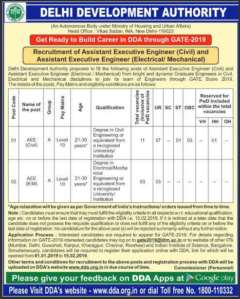Delhi Development Authority (DDA) Recruitment through GATE 2019