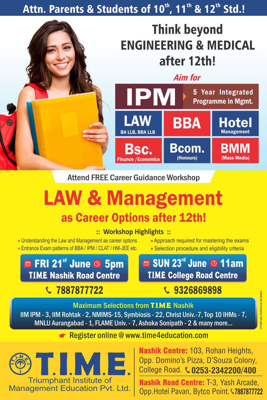 Venue:  T.I.M.E. College Road Centre - 103, Rohan Heights, Opp. Domino's Pizza, D'souza Colony, College Road, Nashik - 422005   |  Mob. 93268 69898